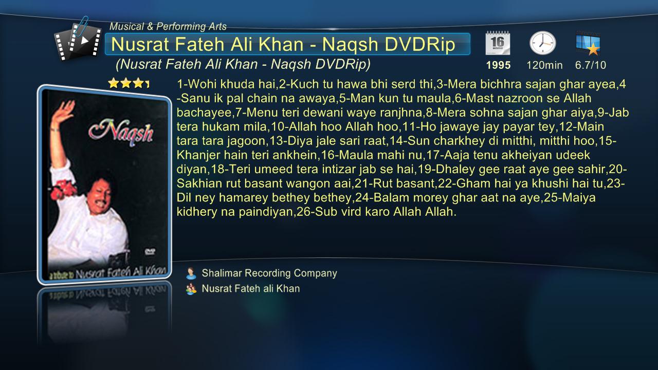 Let me first let u know the entire Tracks, It’s a compilation of NFAK Solo Tracks… No need to write anything else….Enough to blow you minds offff… DVDNaqshTrack #****SongTrack 1Wohi Khuda HaiTrack 2Kuch To Hawa Bhi Sard ThiTrack 3Mera Bichhra Sajan Ghar AyaTrack 4Saanu Ik Pal Chain Na AaweyTrack 5Man Kun Tu MaulaTrack 6Mast Nazroon Se Allah BachaayeTrack 7Menu Teri Dewani Waye RanjhnaTrack 8Mera Sohna Sajan Ghar AayaTrack 9Jab Tera Hukum MilaTrack 10Allah Hoo Allah HooTrack 11Ho Jawaye Jay Payar TeyTrack 12Main Tara Tara JagoonTrack 13Diya Jale Sari RaatTrack 14Sun Charkhey Di Mitthi, Mitthi HooTrack 15Khanjer Hain Teri AnkheinTrack 16Maula Mahi NuTrack 17Aaja Tenu Akheiyan Udeek DiyanTrack 18Teri Umeed Tera Intizaar Jab Se HaiTrack 19Dhaley Gi Raat Aye Gi SaharTrack 20Sakhian Rut Basant Wangon AaiTrack 21Rut BasantTrack 22Gham Hai Ya Khushi Hai TuTrack 23Dil Ne Hamarey Bethey BetheyTrack 24Balam Morey Ghar Aat Na AyeTrack 25Maiya Kidhery Na PaindiyanTrack 26Sub Wird Karo Allah Allah A Few Screenshots:-