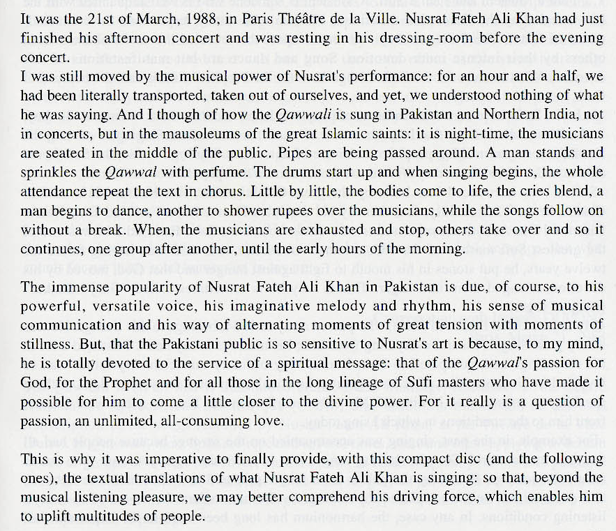 This Interview followed Nusrat Fateh Ali Khan’s First ever performance in France in 1988, what is now known to be one of his greatest performances ever…….Interviewer, Jacques couldn’t help mentioning that he was he “literally transported, taken out of himself and yet he understood nothing of the Lyrics” , Well I had almost the same feeling when I heard this entire concert… You know which one I am talking about right???